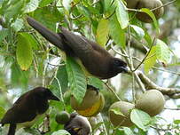 Ces troupes sont habituellement composées d'un ou deux couples nicheurs auxquels vient s'adjoindre un nombre variable d'immatures. La couleur de la petite pièce de peau nue située en arrière de l'oeil est sensée fournir des renseignements sur l'âge de chaque individu. Les geais enfumés recherchent leur nourriture à tous les niveaux de la végétation. Ils descendent volontiers à terre où ils fouillent dans la litière de feuilles et se déplacent en bondissant. A l'intérieur de la canopée, ces oiseaux glanent des insectes dans les feuillages et inspectent le bois pourri ou l'écorce qui se décolle. Occasionnellement, ils poursuivent les insectes en vol. Les geais enfumés ont un vol lourd et légèrement ondulant composé d'amples battements d'ailes qui alternent avec de longues glissades.Alimentationmode et régime